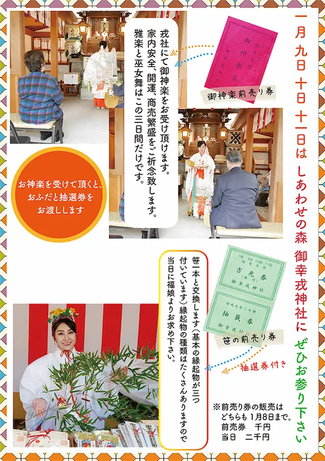 吉兆券(笹券)・神楽券は、前売りが1000円・当日が2000円となっております。